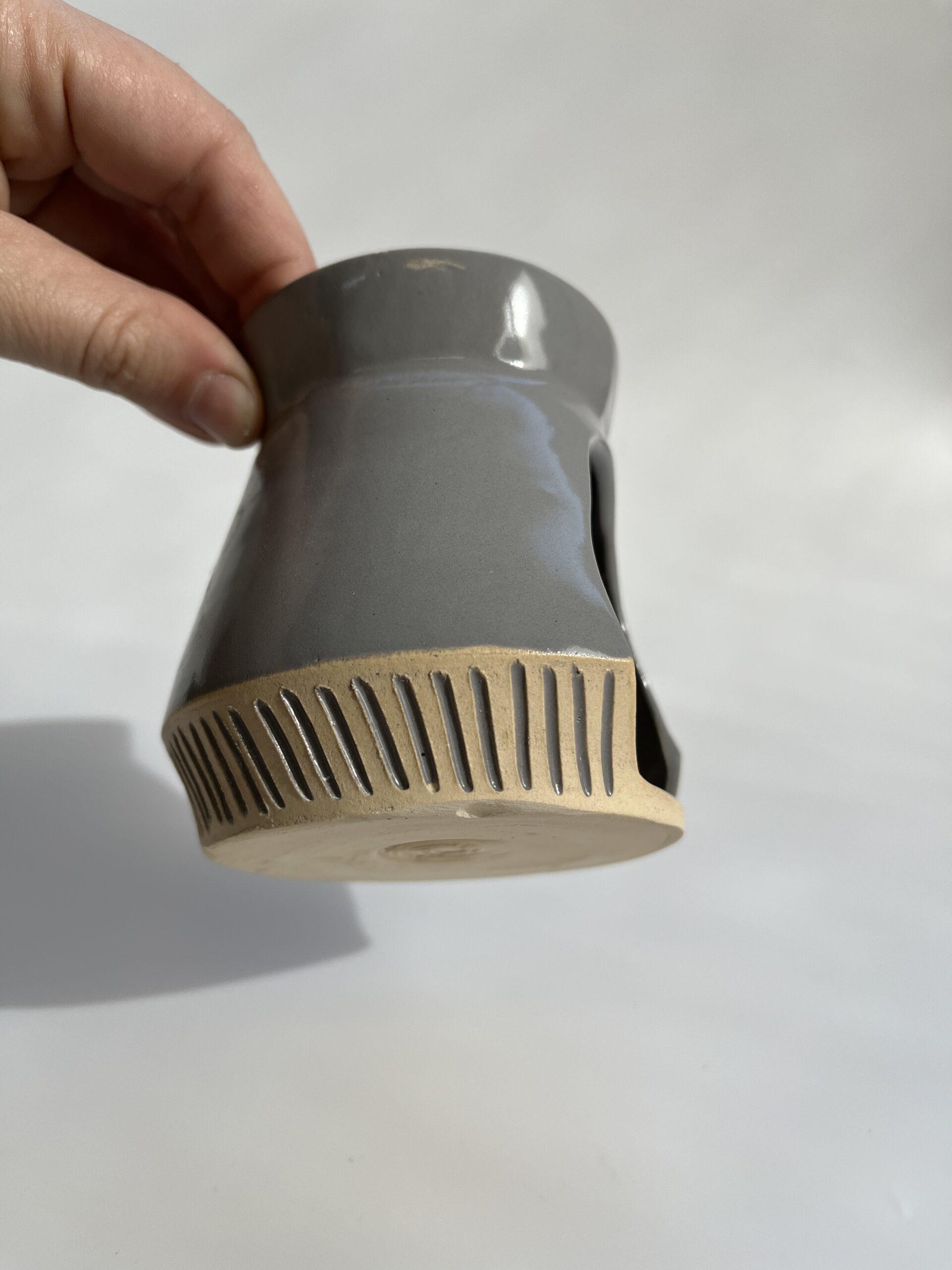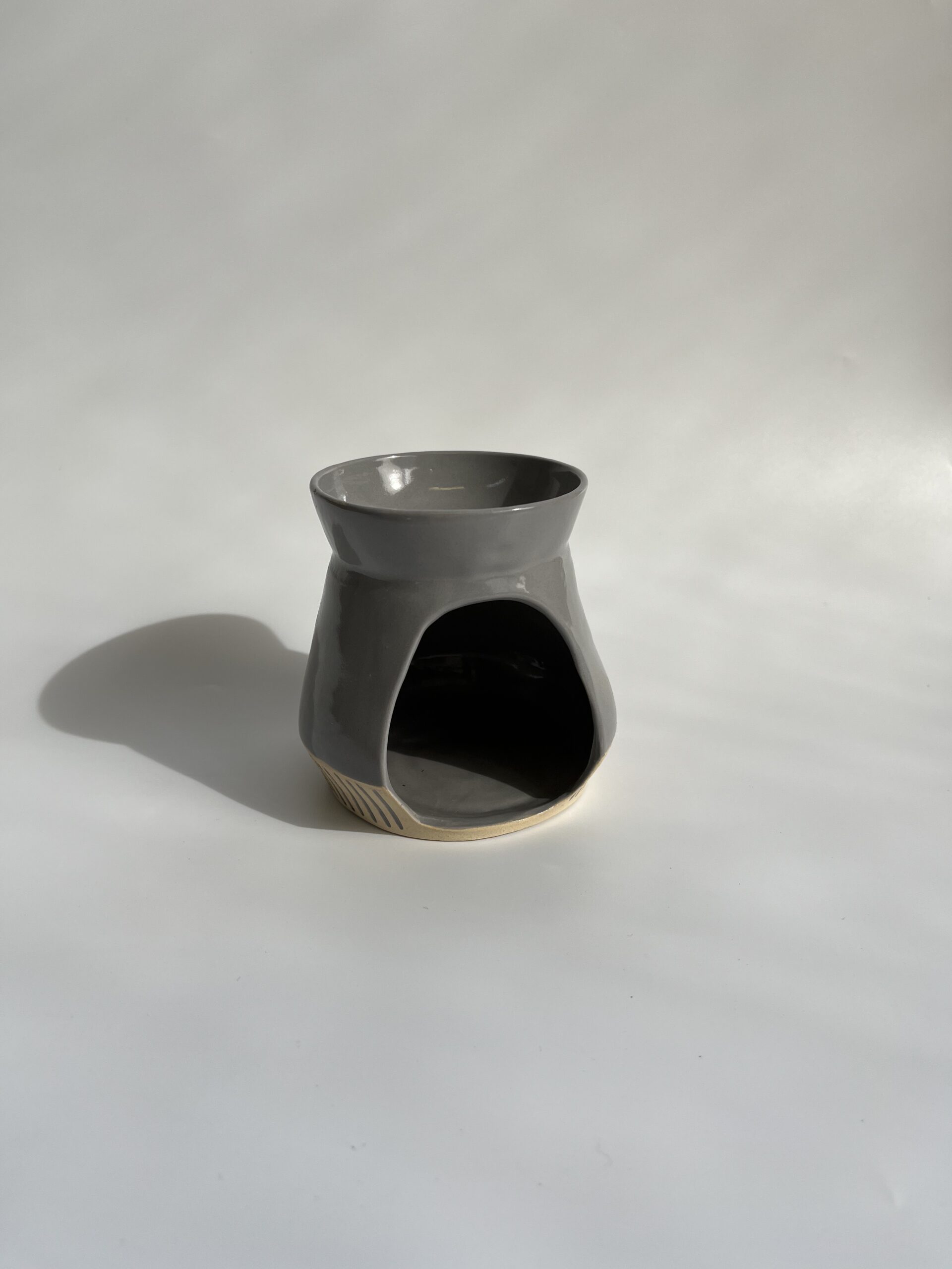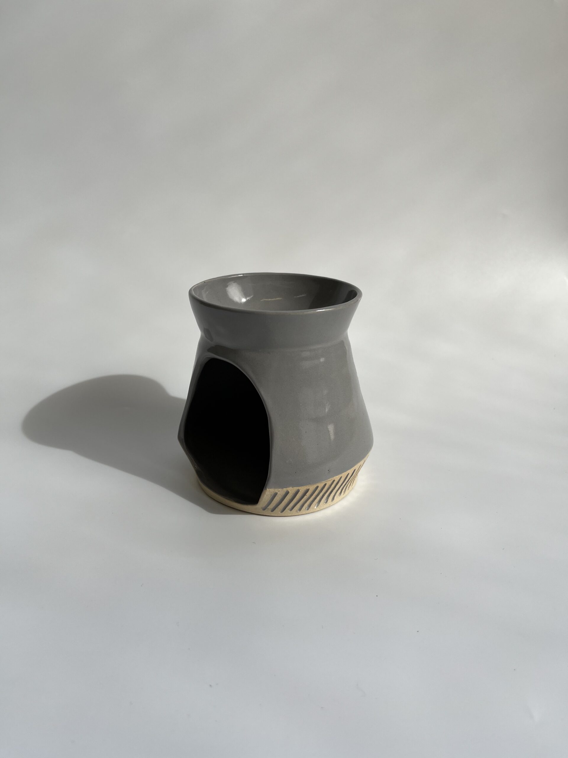 להפצת ריח ואווירה טובה בבית, מבער עם קערית מובנית, זיגוג אפור ועיטור פסים מגולפים צבועים