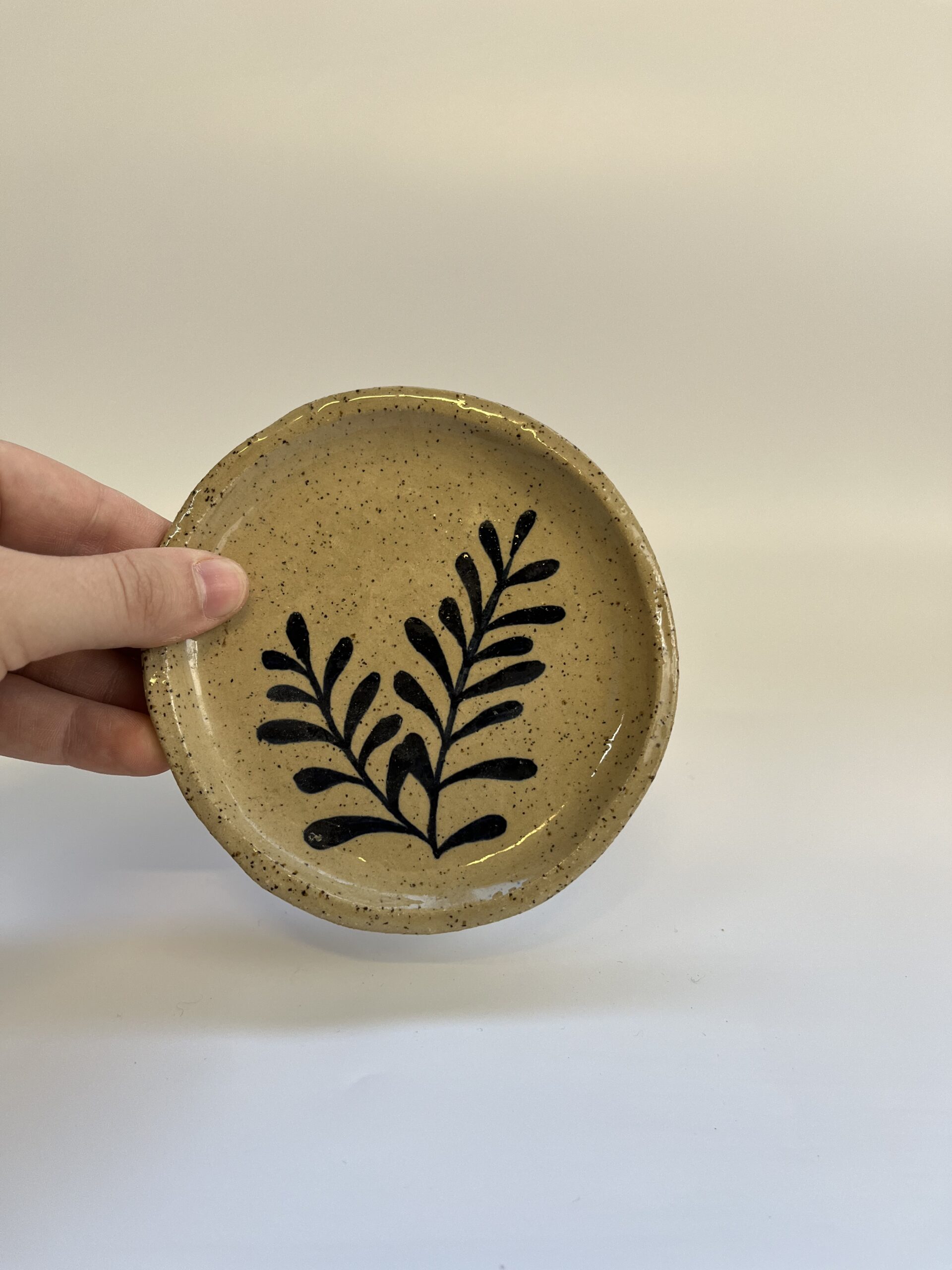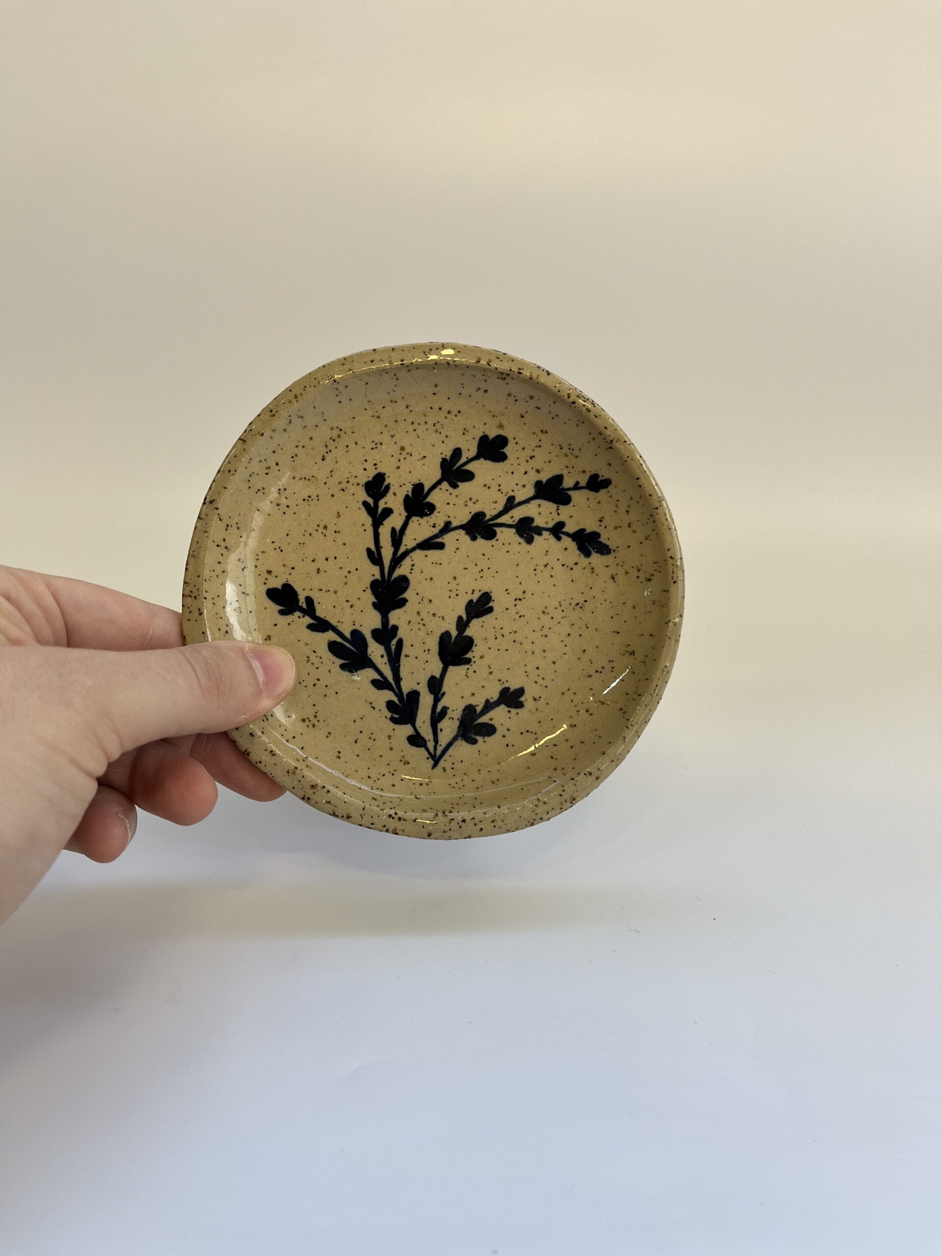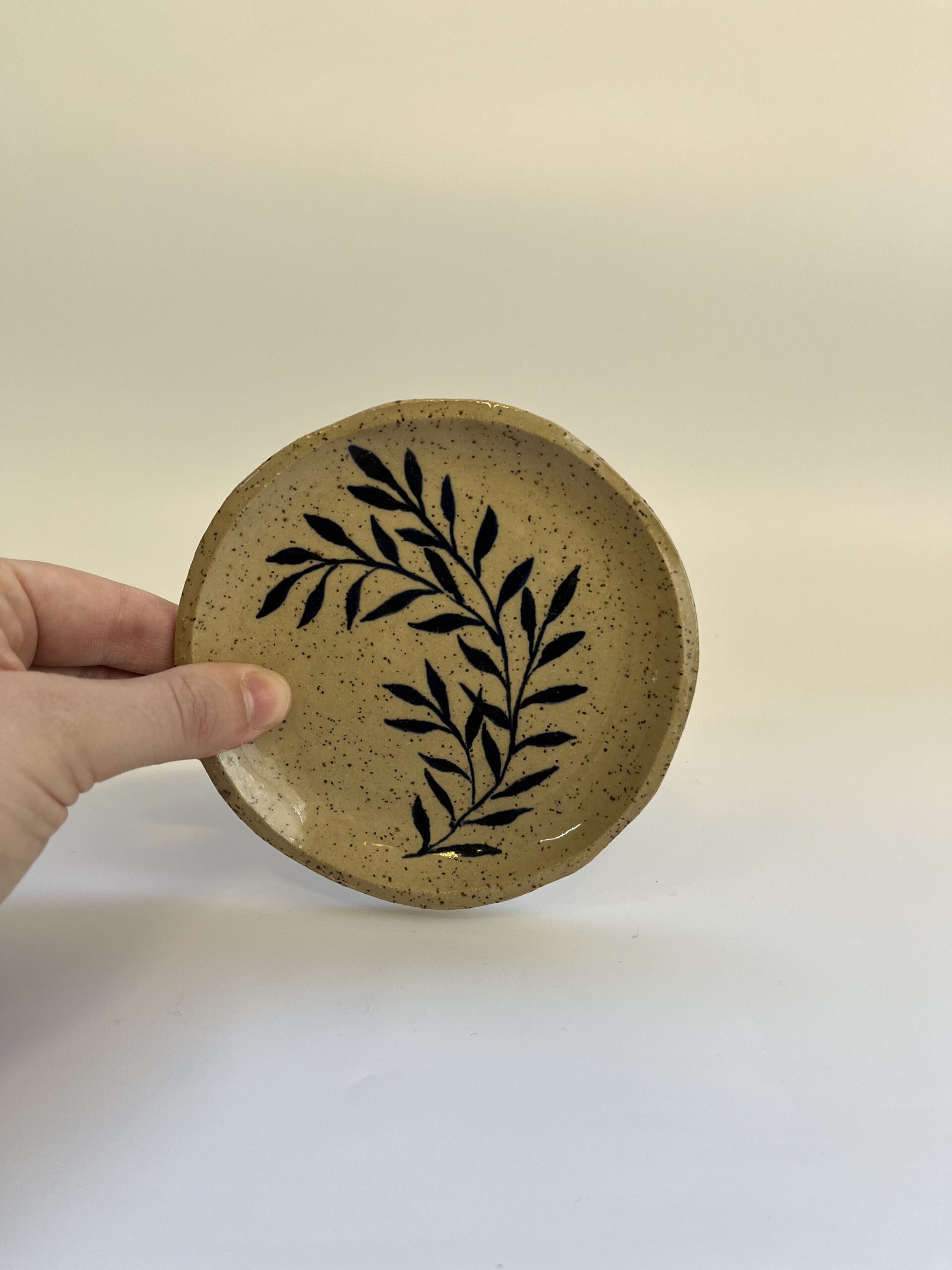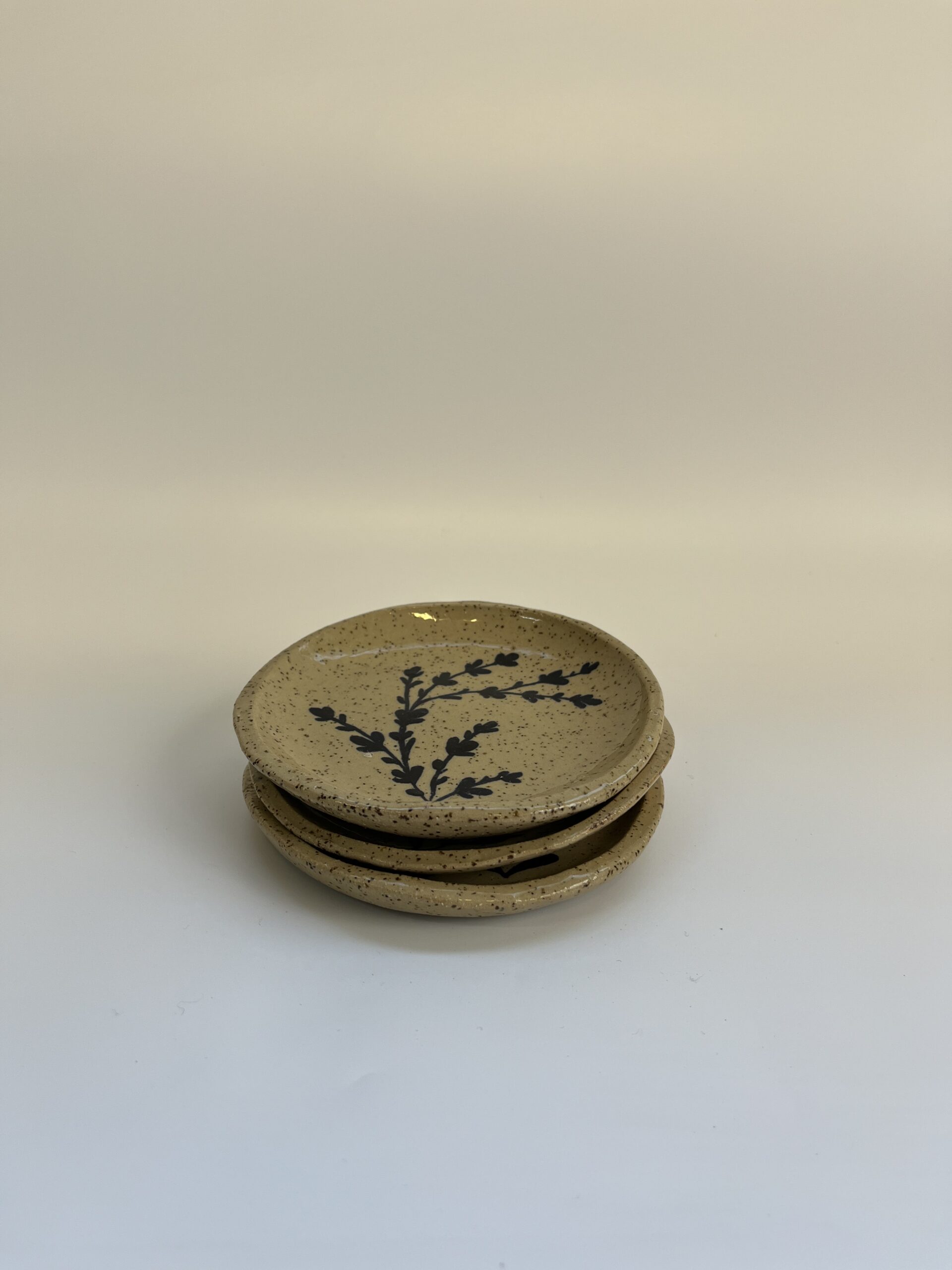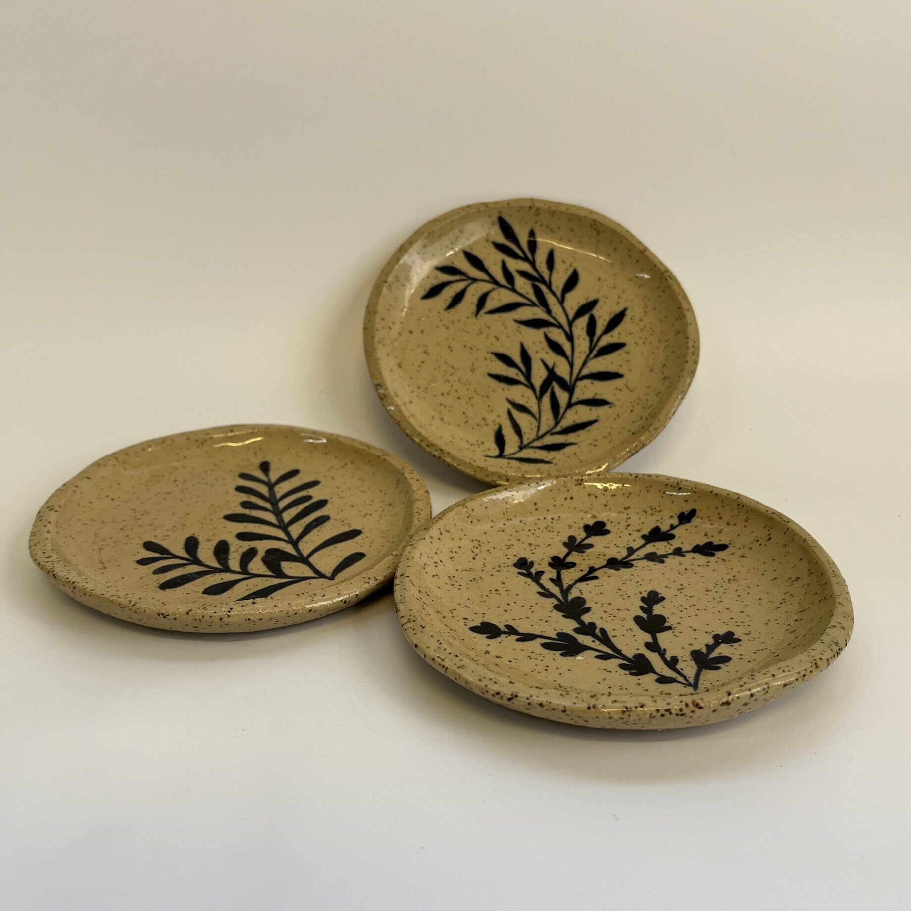 סט של 3 צלוחיות קרמיקה קטנות, עם איור עלים בכחול כהה על גבי חימר חרדל מנוקד עדין. עיצוב מינימליסטי ורגוע